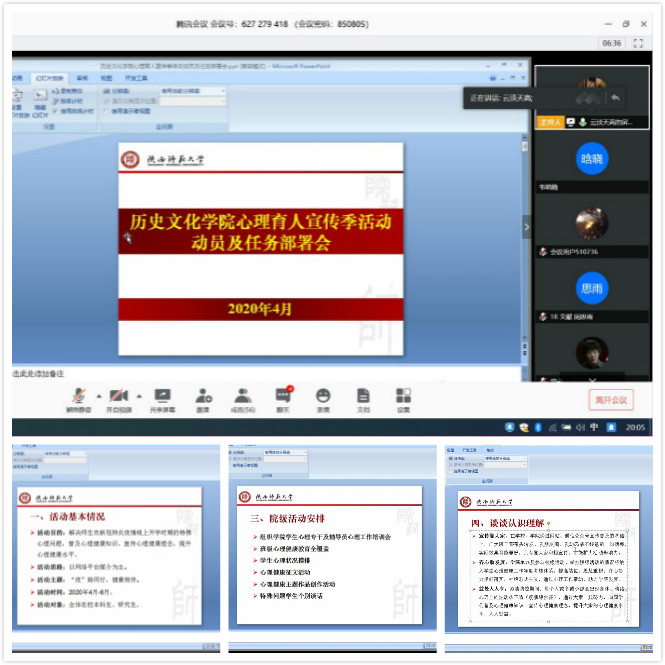 程蕾随后进行了总结动员,强调受疫情影响,同学们宅家网上学习期间很容易出现情绪、心理上的波动或不适,加之,春季又是心理问题的高发期,心理健康教育非常有必要,辅导员和班干部都要重视,做到心理健康教育与思想政治教育同向同行,把心理工作做细做实做好;要求要通过公众号和网站加大宣传力度,严密组织,充分发挥各年级辅导员、各班班委的作用,动员广老员工积极参与本届心理育人季校级和院级活动,号召大家要以这次活动为契机,关注关心关爱心理问题员工,确保活动效果;指出学院学工口要围绕二级心理辅导站建设这个重点难点,加大谋划和推进力度,争取早日建成,为学院广大师生服务;对大家付出的辛勤努力表示感谢,并提醒大家不信谣不传谣,开学时间一定要以学校官方通知为准。