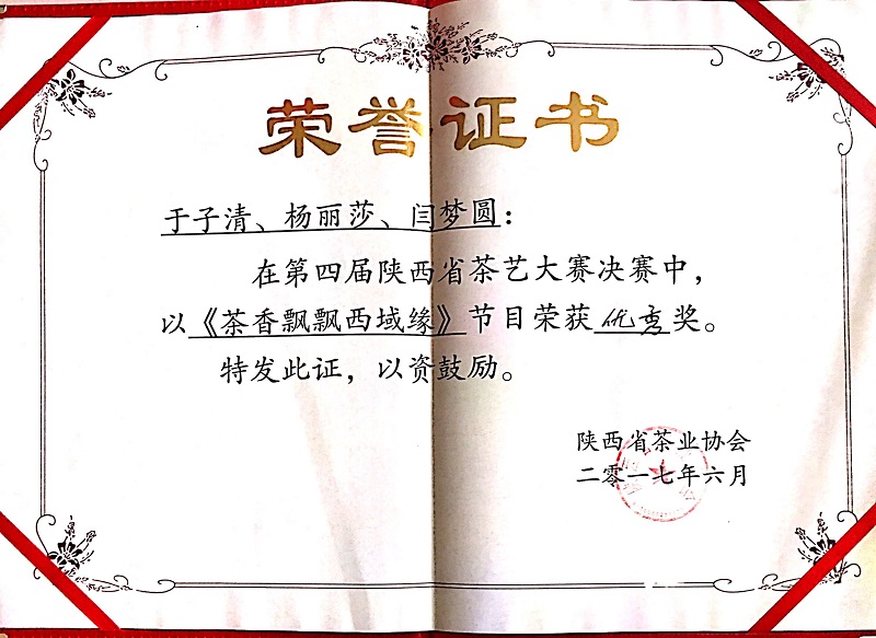 2017年6月11日下午,陕西省茶业协会在西安市曲江国际会展中心B4馆举办了陕西省第四届茶艺大赛决赛。公司2015级于子清、杨丽莎、闫梦圆三位同学报送的节目——《茶香飘飘西域缘》通过三轮选拔,最终在决赛中荣获“优秀奖”。同时,永利集团在4月至6月期间积极配合和参与陕西省茶业协会所组织的茶艺大赛相关活动,在最终的颁奖环节中荣获“优秀组织奖”。